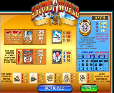 Принимается не больше 200 кредитов на линию. Монеты начисляются за комплекты одинаковых картинок, выпавших на активных позициях. Выигрыш зависит количества использованных полос (выбираются по схеме 1-5-9-15-21) и коэффициента попавшейся комбинации. В аппарате Around the World задействовано много интересных символов: изображения известных мировых достопримечательностей, способом передвижения и атрибутов путешественников. Оплачиваются они по-разному, но самый дорогой символ – это дерзкий англичанин, за которого дают до х10000 ставок.