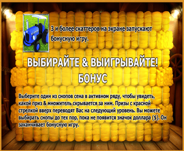 В процессе игры можно открыть бонусный раунд, это происходить когда на экране появляется три и больше символов разброса. Пользователям рекомендуется собирать тюки с сеном, которые скрывают определенное вознаграждение. Этот процесс будет продолжаться до тех пор, пока не выпадет доллар. Только после этого бонусный тур будет пройден, а вся выигранная сумма зачислена геймеру.