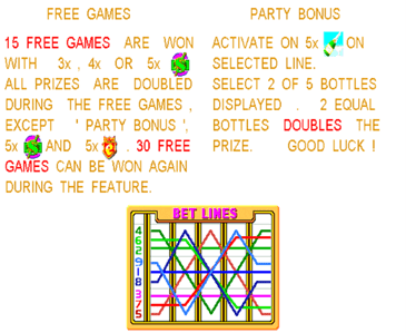 Слот имеет бонусный раунд, который увеличивает выигрыш в несколько раз. Он открывается если выпадет три бутылки. Пользователю необходимо будет выбрать из пяти бутылок одну, в ней будет указанно во сколько раз увеличится выигрыш.