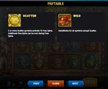 В качестве основных изображений аппарата Квест Индианы используются изображения каменных идолов разного цвета и формы. Специальные символы игры – скаттер и вайлд – золотая монета и шляпа Джонса.