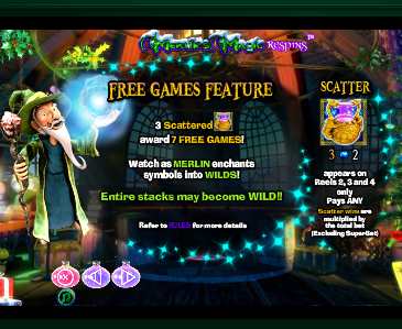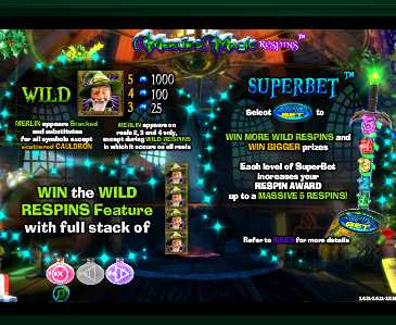 - Wild (Мерлин) – полностью заполняет средние барабаны, но респины «выбрасывают» его и в другие позиции (тогда вайлд может составлять собственные последовательности); заменяет простые иконки, если это нужно;