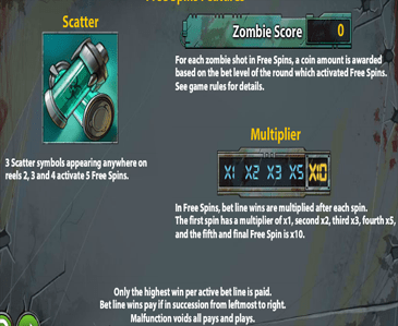 Для игры слот имеет 25 линий и пять барабанов, на которых можно делать ставки от 0,20 до 200 долларов. Также тут присутствуют специальные символы Вайлд и Скаттер, позволяющие увеличить шансы на победу. Аппарат Зомби за реальные деньги доступен каждому желающему в режиме онлайн.